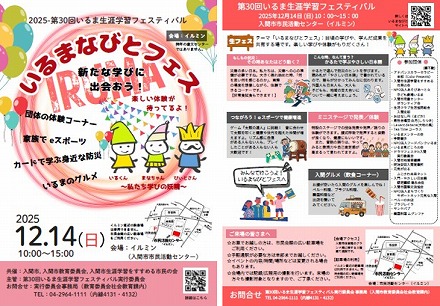 2025-第30回いるまなびとフェスは、生涯学習活動による「学びの成果の共有」、「いるまなびと同士の交流機会」の場を提供することで、学習意欲を高めるとともに、「学びの活用と学びあい」を、促進し、市民と行政との協働によるまちづくりを目指すものです。