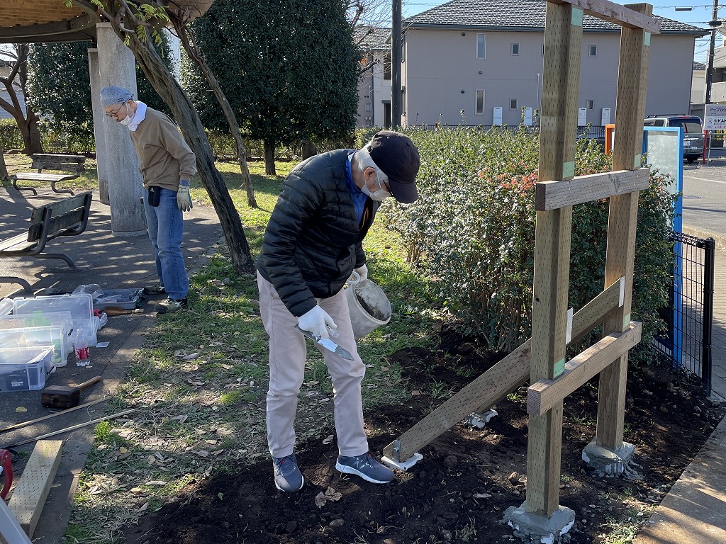 ここさくら公園は近くにビルがあり、強風の時は「けいじばん」の前面にあるアクリル板が外れる事故が何回かありました。設置場所が良くないと判断し、他の場所を探しました。近くの藤沢中央公園が最適であるとの結論が出て、そこに移設することになりました。移設の申請を行い許可が出てすぐに現状の掲示板を撤去しました。あらかじめ決めておいた藤沢中央公園の場所に柱の穴を掘りコンクリートを埋め新たに「けいじばん」を設置しました。